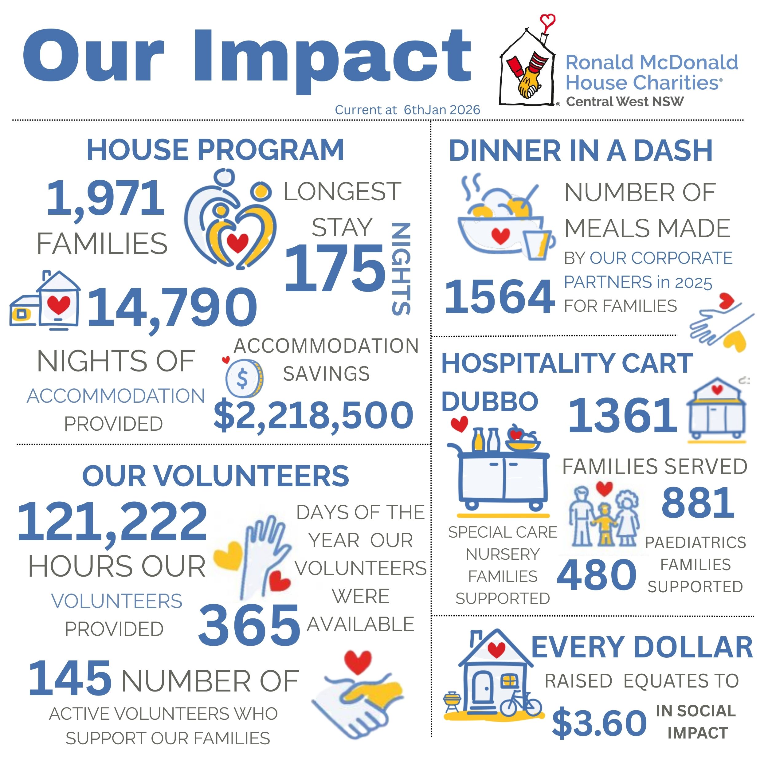 Since opening we've supported over 1800 with accommodation and over 1000 families in the Paediatric and Special Care Nursery in Dubbo. Our program will soon include a Hospitality Cart at the Bathurst Hospital in early 2026.